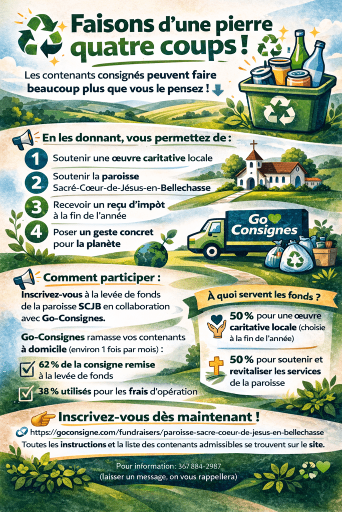 En date du 31 décembre 2025, la fabrique a récolté un total de 221 846,52 $ pendant la campagne de contribution volontaire annuelle (capitation). Conformément à la résolution de l’Assemblée de fabrique adoptée le 20 mars 2025 qui mentionnait que la mission de l’Église est de s’impliquer auprès des personnes les plus vulnérables et de soutenir les communautés, un montant équivalant à 5 % des revenus sera versé à l’organisme Les Frigos Pleins. La somme à remettre s’élève donc à 11 092,33 $.