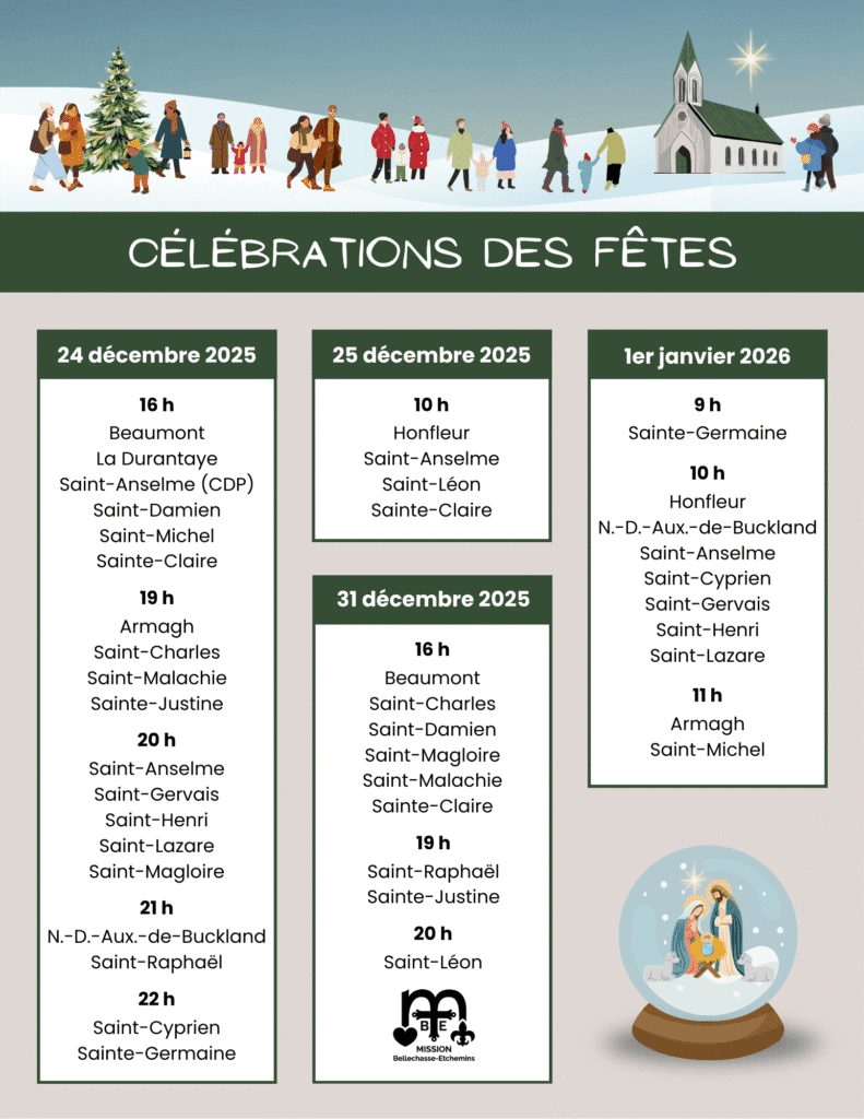 Le lancement de l’année pastorale 2025-2026 et l’installation des prêtres aura lieu le 30 novembre 2025, à 11 h, à l’église de Saint-Lazare. La célébration sera présidée par Mgr Juan Carlos Londoño. Cette célébration interparoissiale sera l’unique messe de la fin de semaine sur le territoire de Mission Bellechasse-Etchemins et elle sera suivie d’un dîner fraternel.